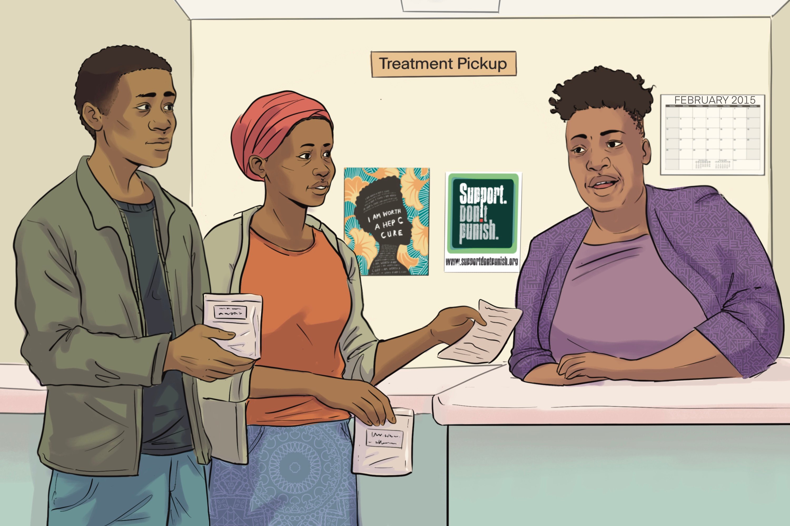 I illustrated a 16-page story presentation by Treatment Action Group for a UNITAID and University of Liverpool project, depicting a South African's experience with Hepatitis C Virus (HCV).